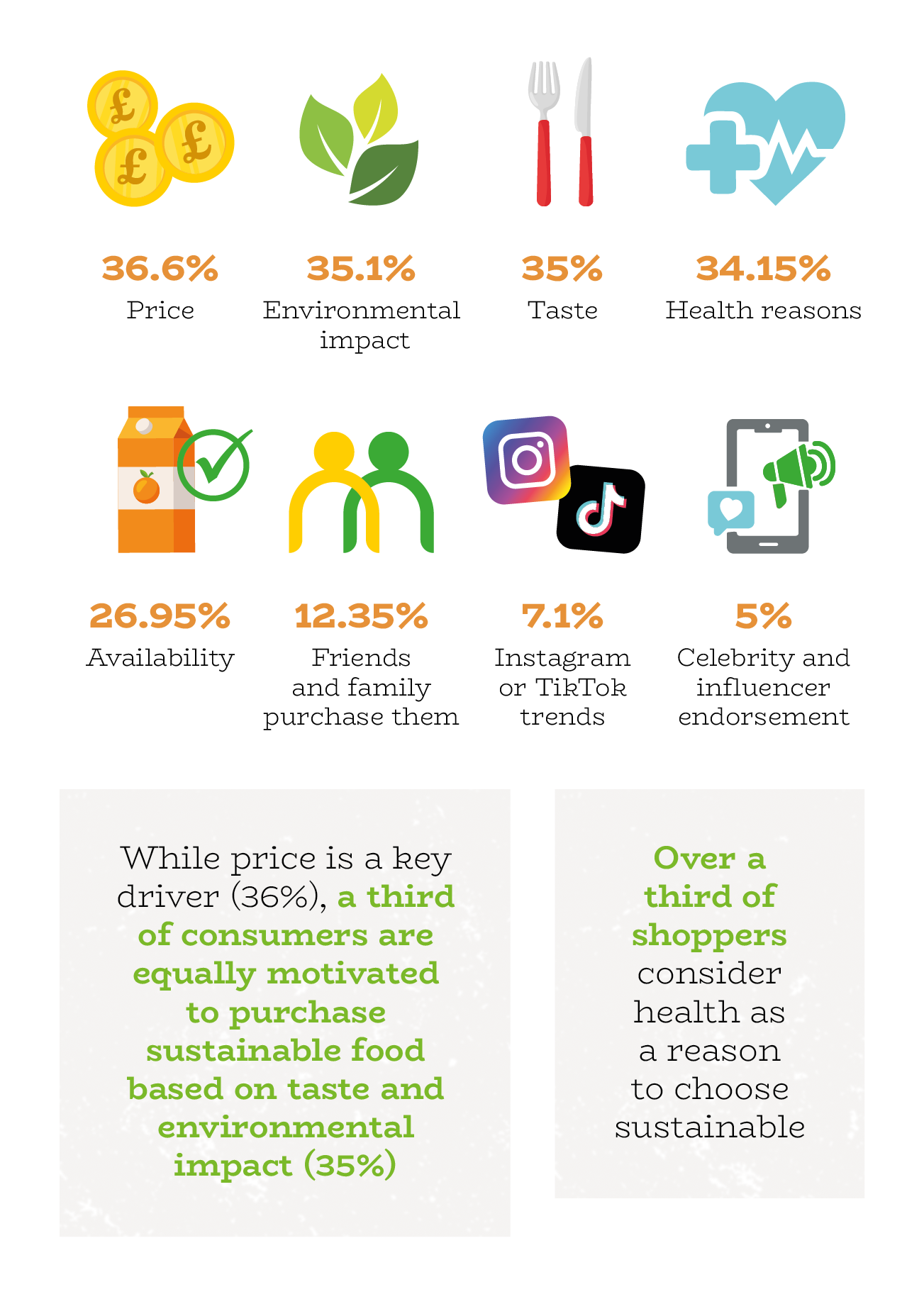 Environmental impact (35%), taste (35%) and health (34%) were equally ranked with price (36%) as motivators for sustainable grocery purchase.